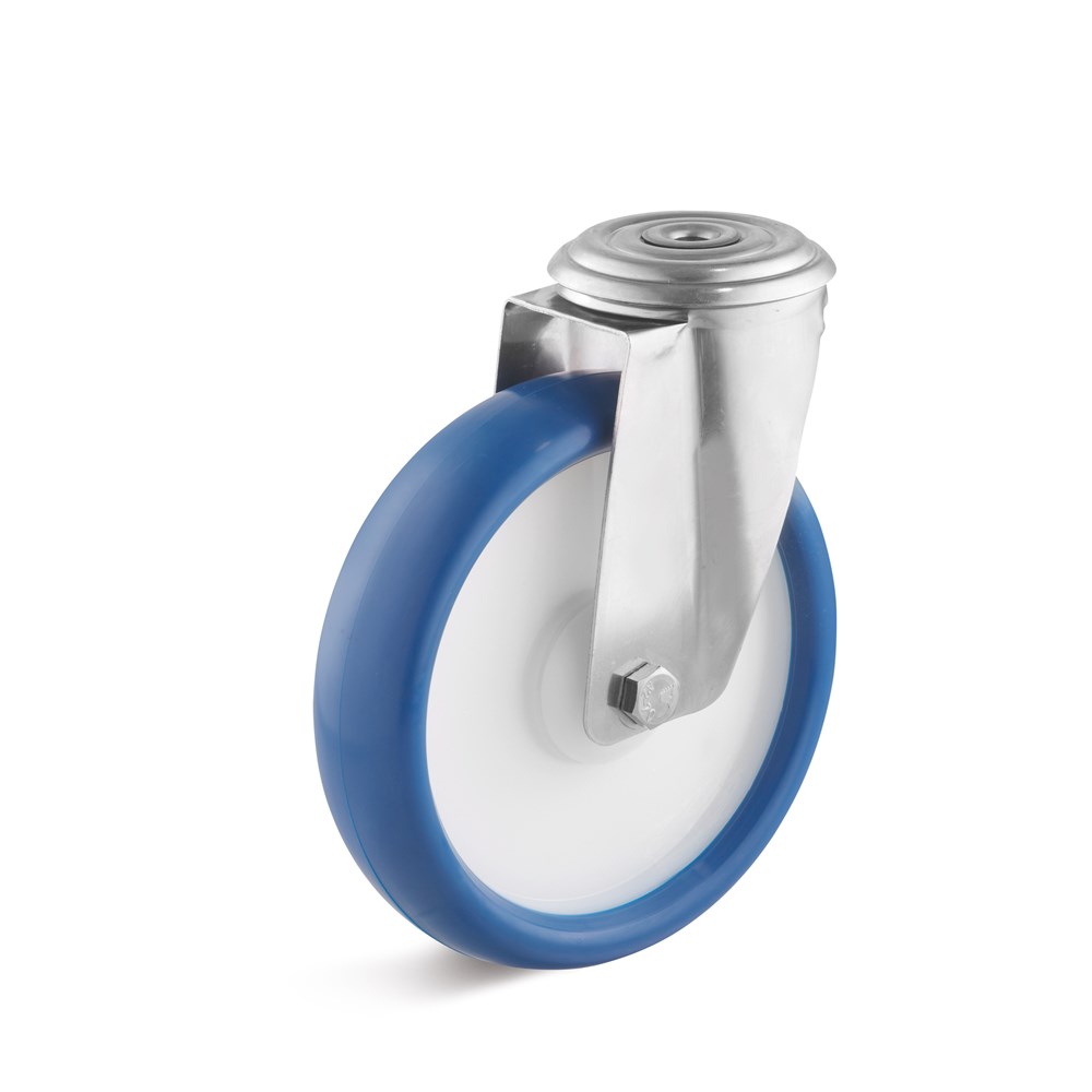 Zwenkwiel met dubbele kogeldraaikrans, polyamide velg met centraal RVS kogellager en polyurethaan band ± 95° Shore