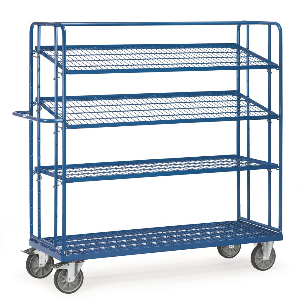 1 vaste en 3 losse etages met ingelast draadgaas, 40 x 40 mm gepoedercoat, 15 mm hoge rand aan de lange zijden