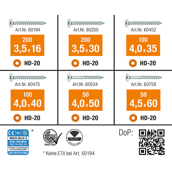 De HECO-L-BOXX mini bevat een selectie van 700 schroeven in 6 maten, inclusief 2 HD-20 bits. De schroeven zitten in de assortimentskoffer in de verzonkenkop uitvoering met freesvlakken en met variabele voldraad en deeldraad. Je kunt de exacte afmetingen direct in de artikelafbeeldingen zien.
