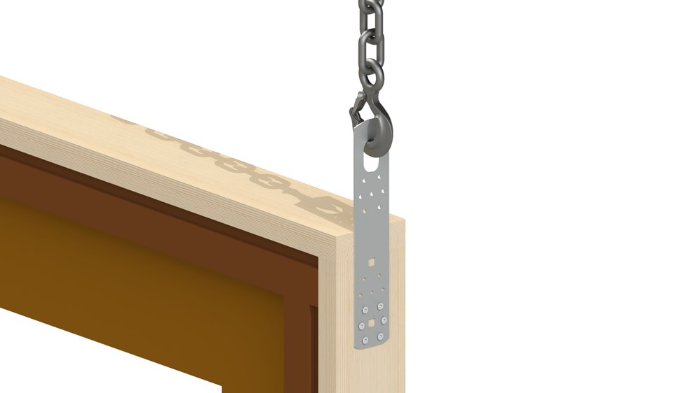 Metalen strip met een oog en schroefgaten, bedoeld als hijsvoorziening voor houten kozijnen, puien en elementen. Het hijsen dient plaats te vinden conform de richtlijnen van de SHR.