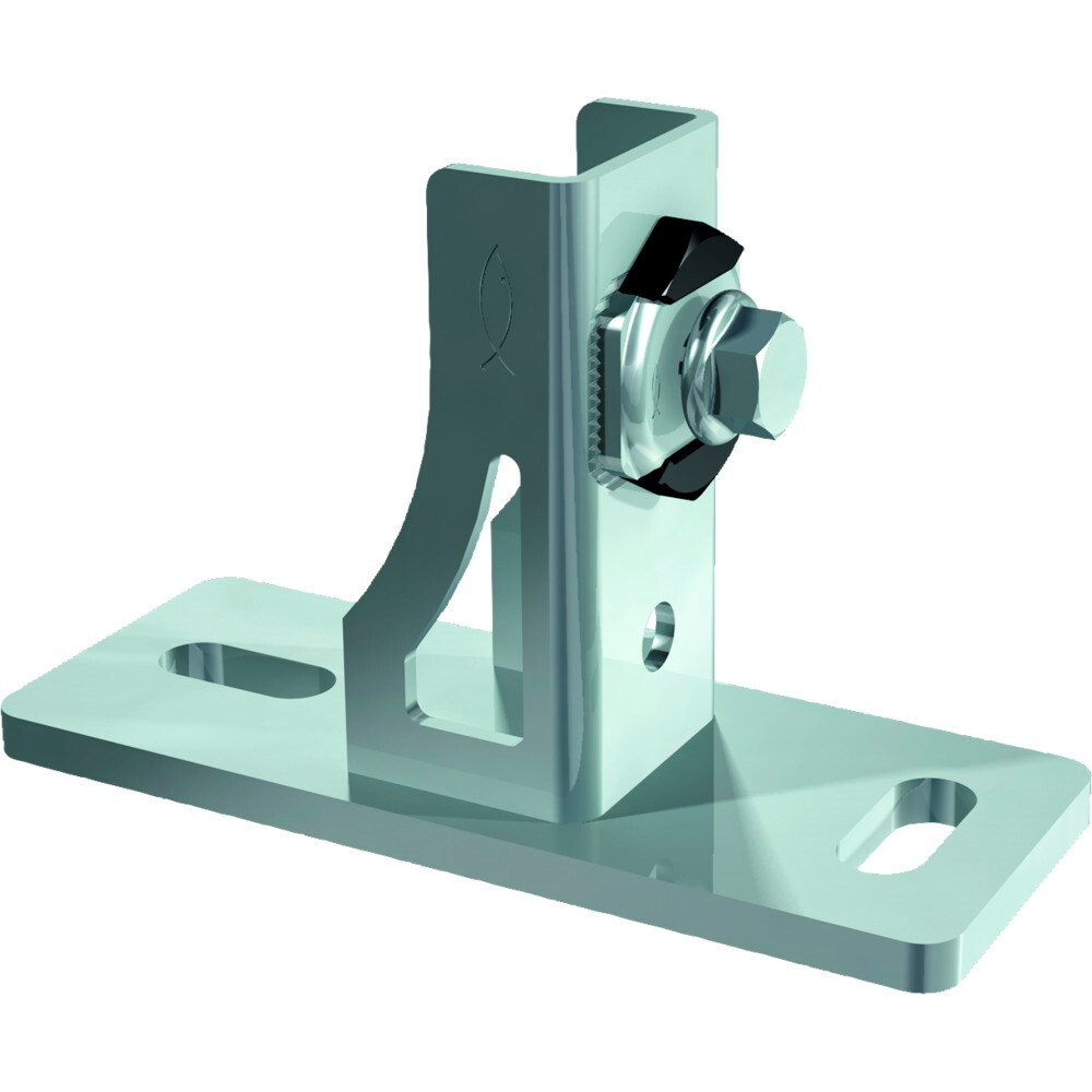 De voorgemonteerde fischer Constructie-element zadelflens SF Clix 31 verbindt de montagerails FLS op betrouwbare wijze onder een hoek van 90° met de ondergrond. Daarbij bespaart het voorgemonteerde element tijd en geld. De bevestigingen van de SF Clix en het exact passende zadel maken een veilige en snelle montage mogelijk. De stevige grondplaat van de SF Clix 90° met de 90° gedraaide slobgaten vergemakkelijkt de bevestiging met behulp van pluggen of ankers aan de ondergrond. De gegalvaniseerde uitvoering is geschikt voor installaties in gebouwen.