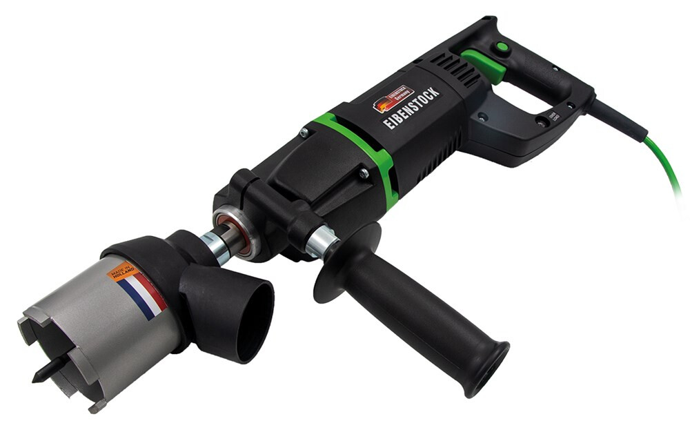 De handzame machine voor het droogboren van installatie boorgaten tot Ø 82 mm in harde materialen zoals kalkzandsteen, klinkers, baksteen en andere abrasieve materialen. Zeer geschikt voor installatiedozen. Met elektronische softstart, thermische- en overspanningsbeveiliging, mechanische slipkoppeling en extra verstelbare handgreep. Voorzien van slijtvast PUR aansluitsnoer. De set bestaat uit machine, dozenboor Ø 82 mm voor metselwerk, stofafzuiging en centreerstift.
