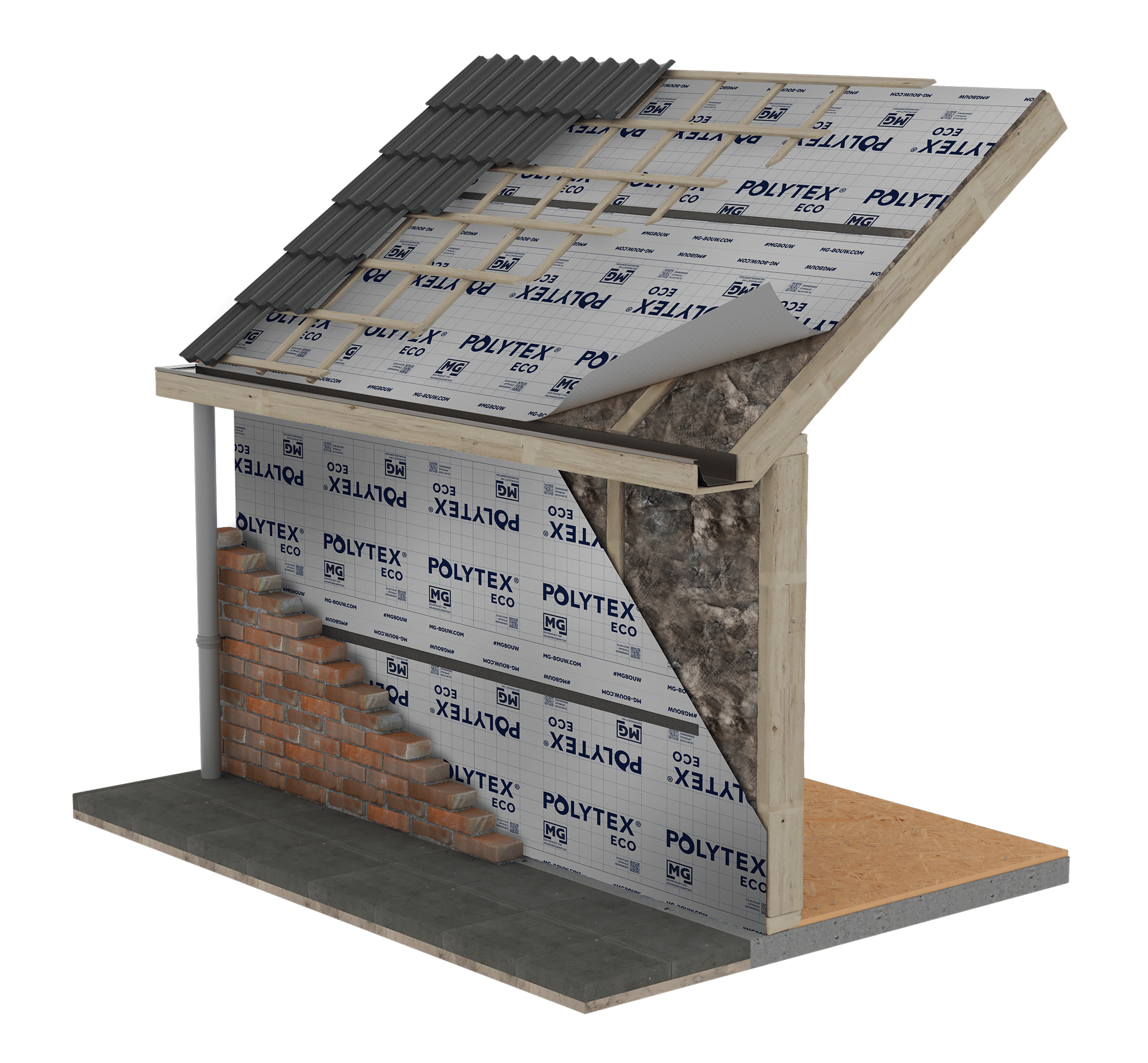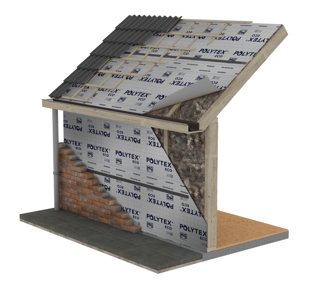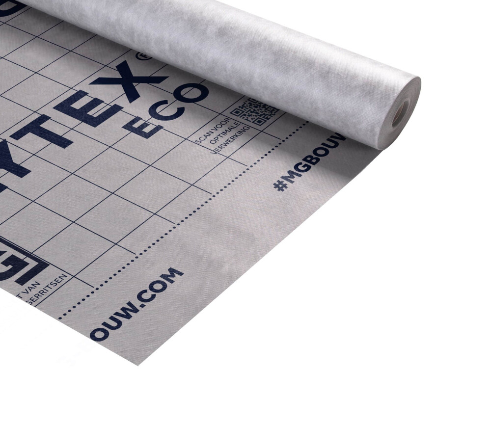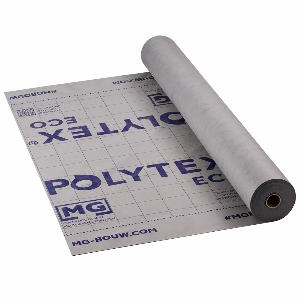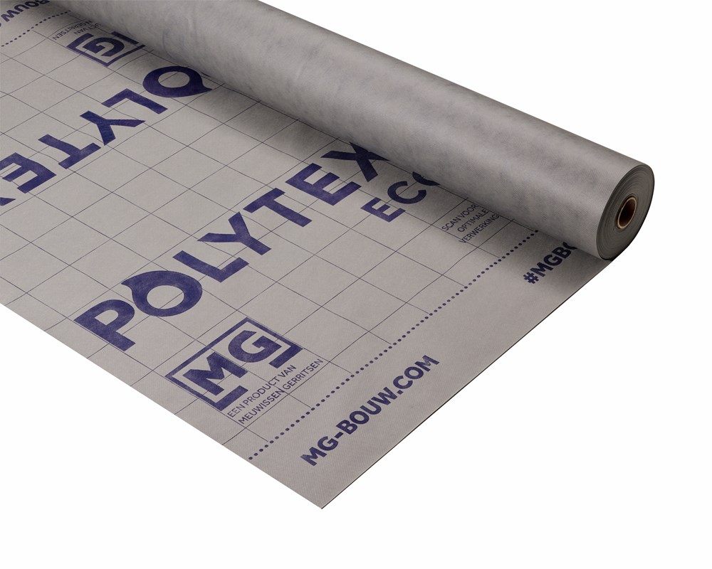 Polytex® Eco is een lichtgewicht waterdichte en damp-open spinvliesfolie. De Polytex Eco is lichter dan de Original en Pro variant en daarmee een economisch alternatief en gemakkelijk te hanteren. De Polytex® Eco beschermt de constructie tegen wind en regen terwij l potentieel damp door de folie wel naar buiten kan.