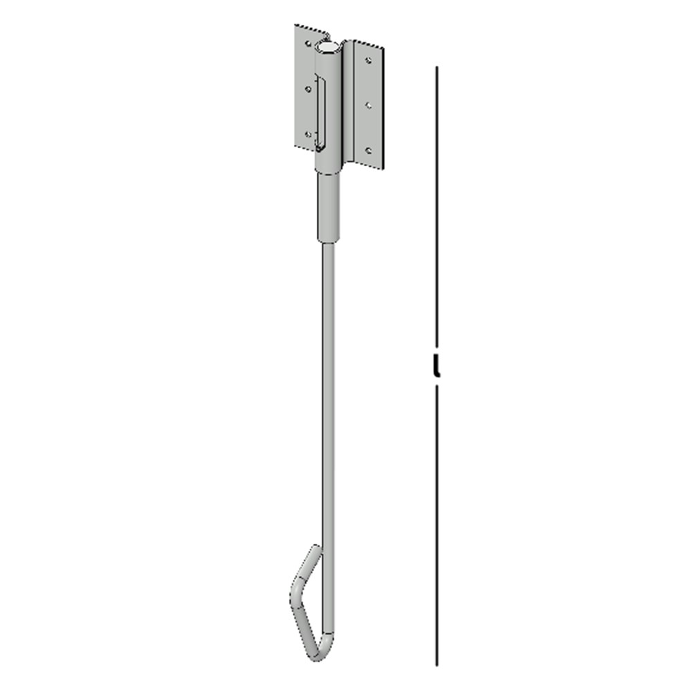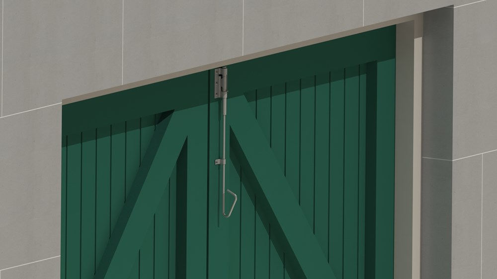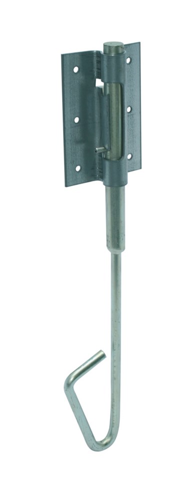 Staartgrendel voor het vastzetten van grote deuren waarbij de pen tot 50 mm in het plafond of een balk boven de deur wordt vastgezet.
