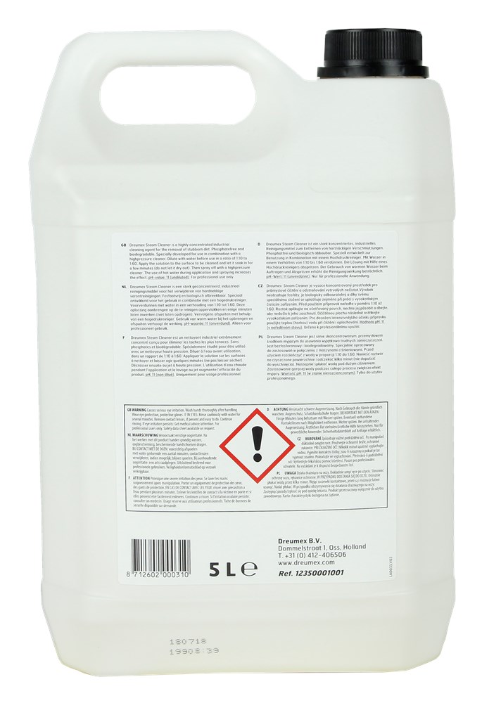 Dreumex Steam Cleaner is uitermate geschikt voor het verwijderen van zware vervuilingen met hogedrukapparatuur. De unieke samenstelling helpt aantasting van hogedrukleidingen te voorkomen. Het product is geschikt voor het reinigen van gevels, vloeren, wanden, machines, dekzeilen, etc. Na gebruik kan het eenvoudig afgespoeld worden met schoon water.