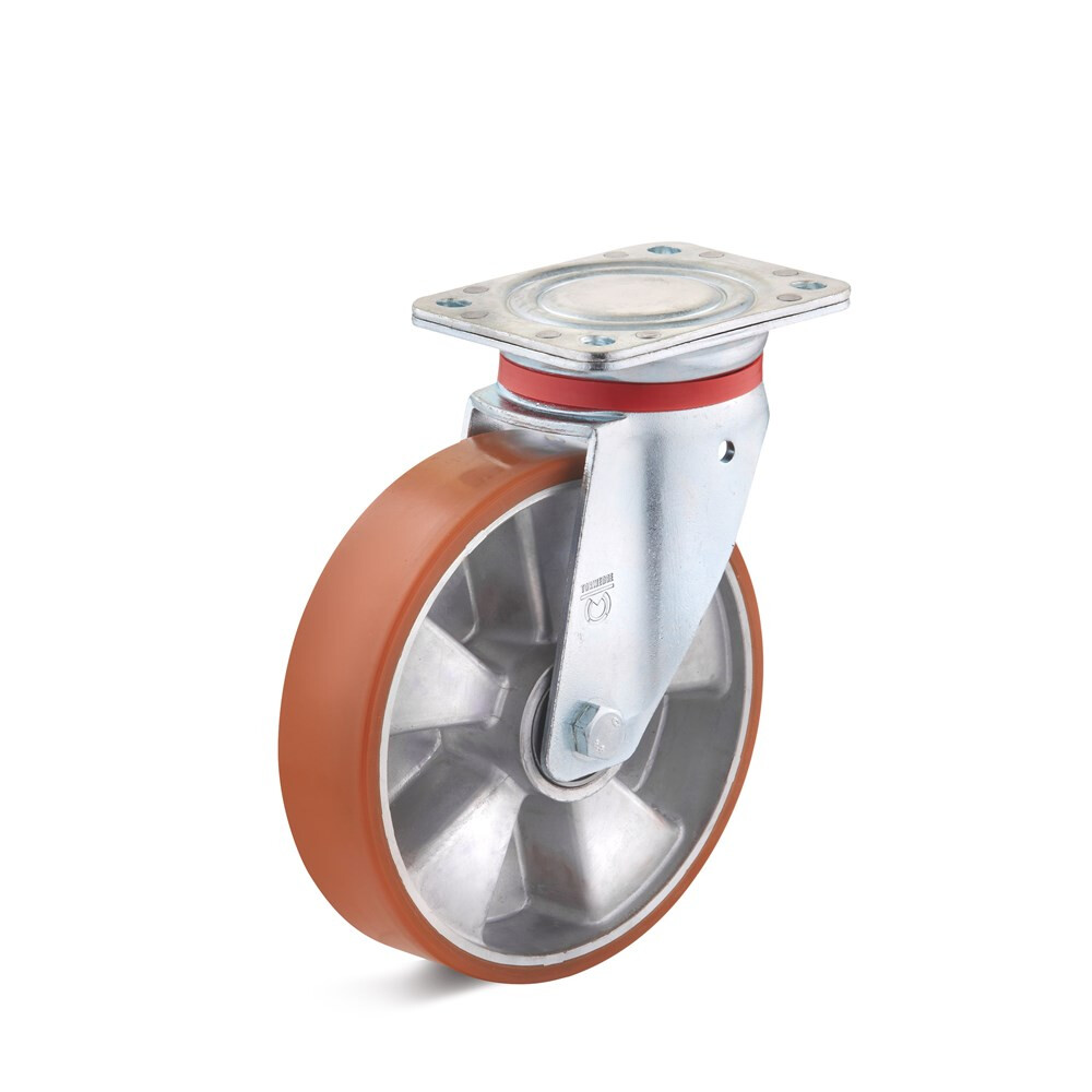 Zwenkwiel met dubbele kogeldraaikrans, aluminium velg met kogellagers en polyurethaan band ± 92° Shore