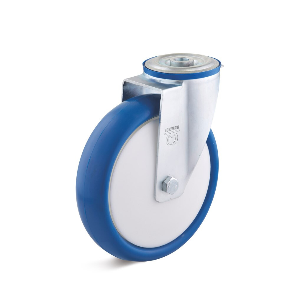 Zwenkwiel 160mm polyurethaan 250kg blauw boutgat