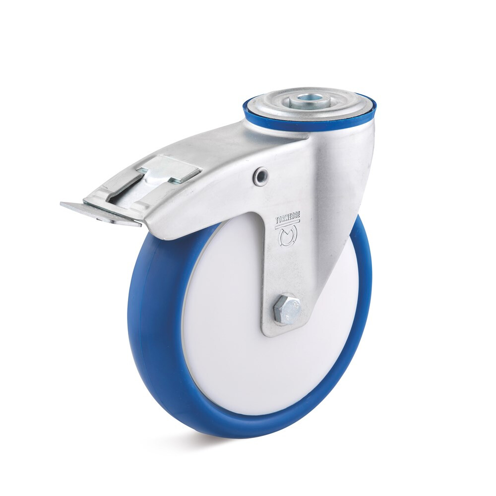 Zwenkwiel+rem 160mm polyurethaan 250kg blauw boutgat