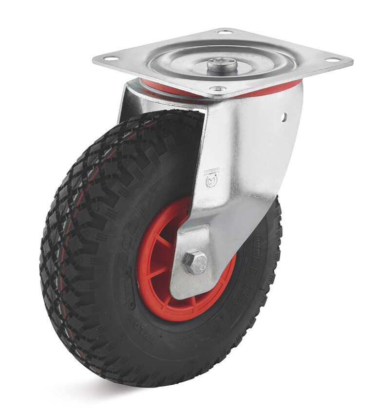 Zwenkwiel met dubbele kogeldraaikrans, kunststof velg met rollager en luchtband met lijn- of blokprofiel