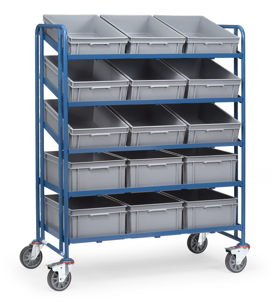 • 5 etages met eurobakken 3 stuks 600 x 400 x 145 mm, 6 stuks 600 x 400 x 170 mm, 6 stuks 600 x 400 x 220 mm